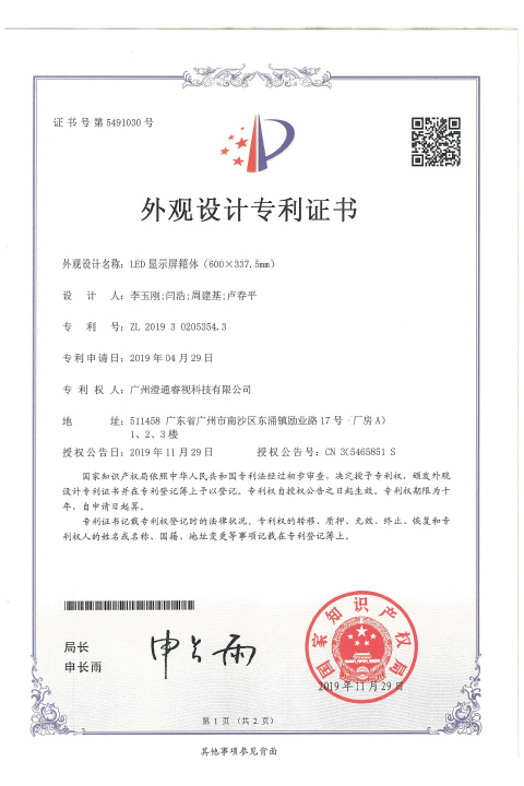 睿視外觀設(shè)計專利證書